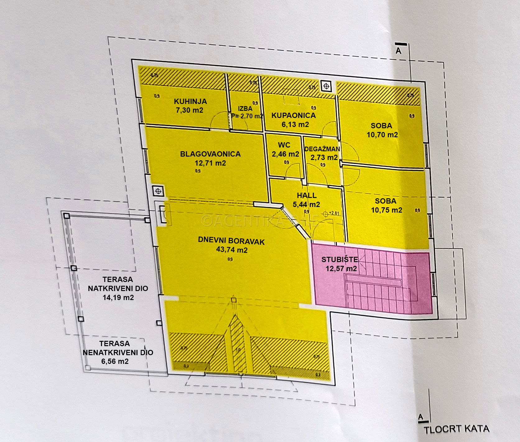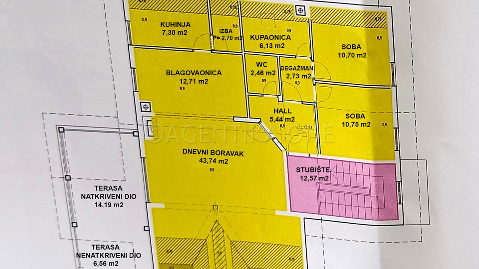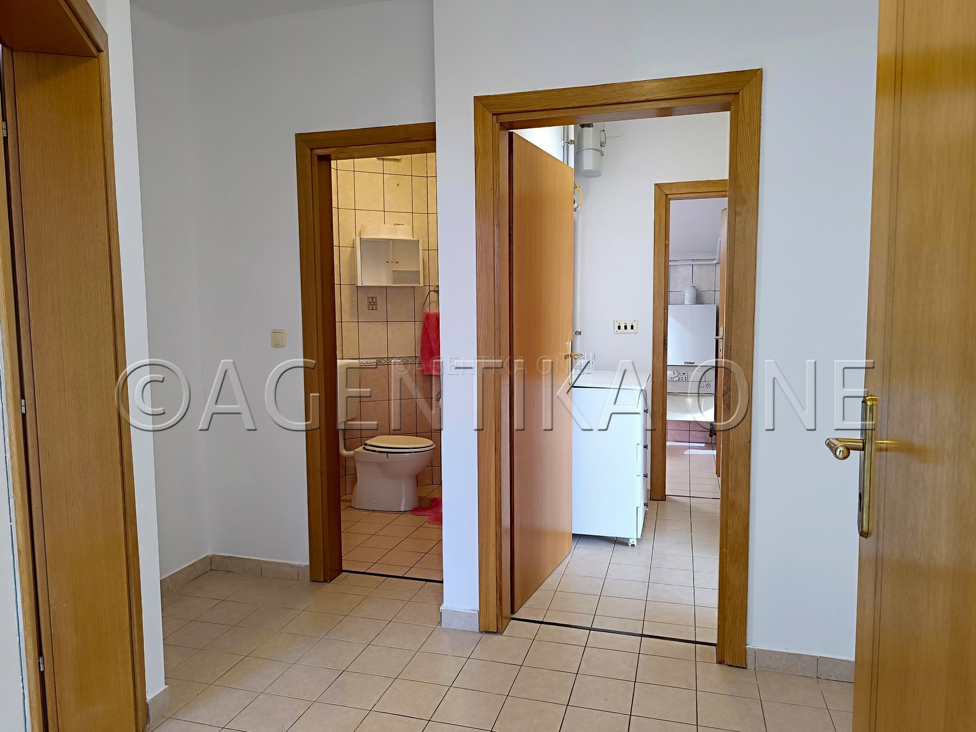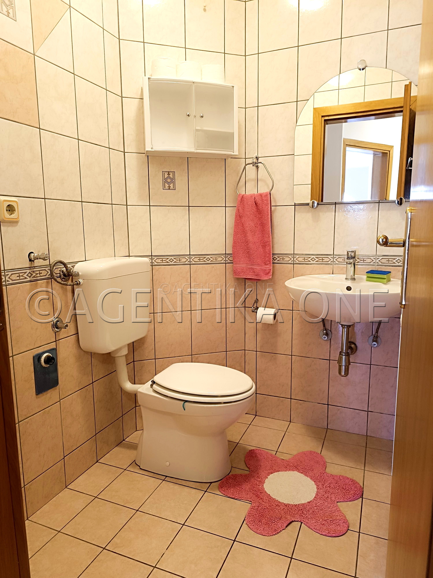 Sastoji se od velikog dnevnog boravka povezanog s blagovaonom, kuhinje s ostavom, velike terase (20,75 m2), 2 spavaće sobe, kupaonice i dodatnog wc-a., a pripada mu i dio okućnice (101 m2). Dnevni boravak je moguće jednostavno pregraditi, te tako dobiti još jednu sobu.